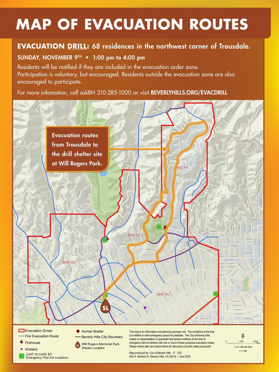 BEVERLY HILLS—On Sunday, November 9, the city of Beverly Hills announced on its Facebook page that it held an evacuation drill in a portion of the Trousdale Estates (Zone BHL301). The meeting point was Will Rogers Park to better prepare the community for a large-scale emergency.