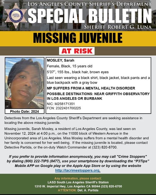 GRIFFITH PARK—On Tuesday, November 12, the Los Angeles County Sheriff’s Department announced on its Facebook page that it is asking for the public’s help to locate At-Risk Missing Person, Sarah Mosley from Los Angeles.