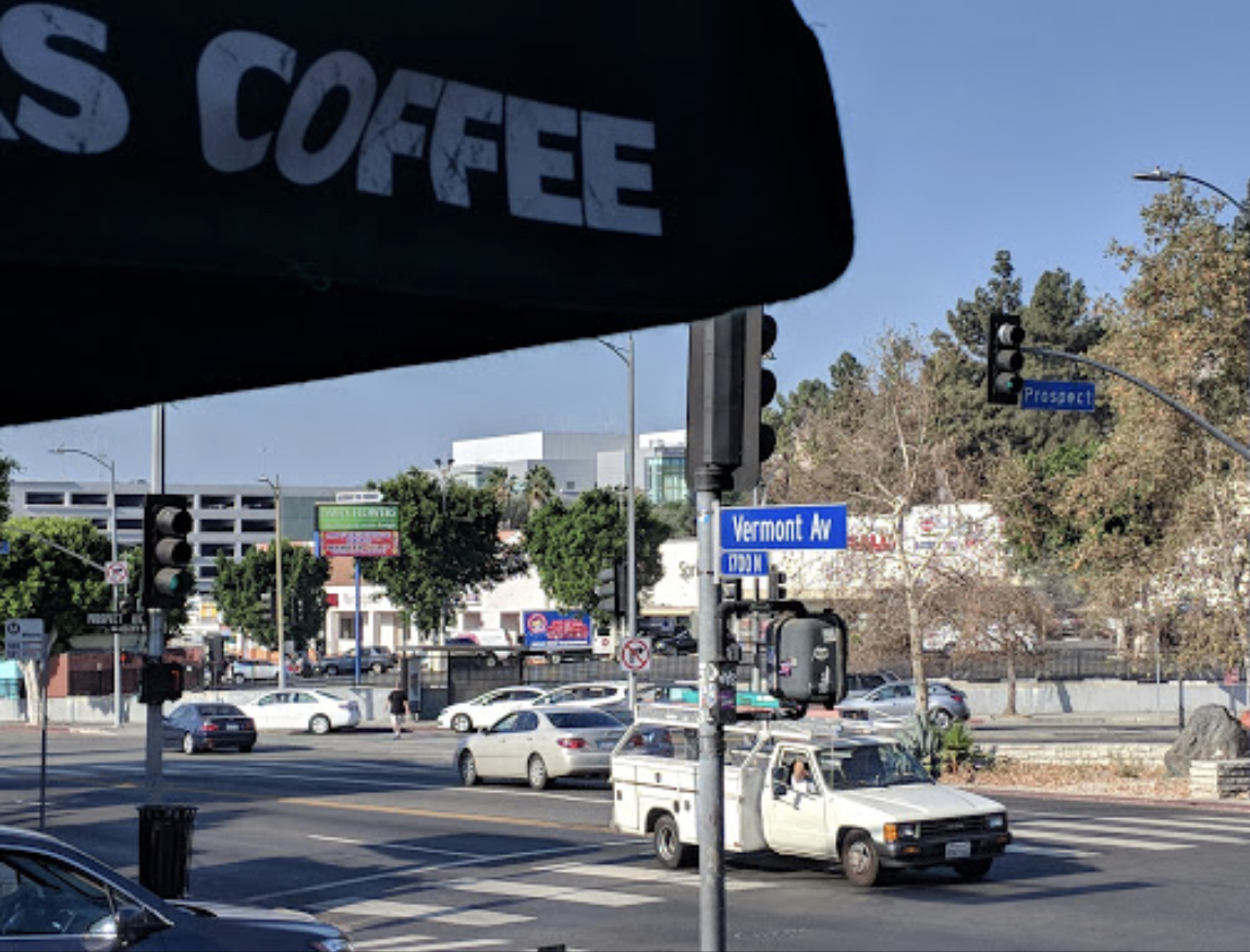 Three minutes later, at around 12:25 a.m., a female victim was sitting on the stairs of the Starbucks at Vermont Avenue and Prospect Avenue when a suspect approached her from behind and put a knife to her throat and slashed her. The female victim fought the suspect off and was able to grab the knife from him, but was stabbed in the stomach in the process.